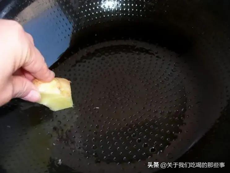 4、醃好的草魚用紙巾擦乾水分備用,不用拍澱粉。炒鍋上竈,開火加熱,先不要加油。切一塊姜,等到鍋熱後用生薑在鍋底擦拭一圈,然後放入適量油。生薑中含有薑汁,在高溫下形成了一層保護膜,再一個就是熱鍋冷油,就可以防止煎魚粘鍋。
