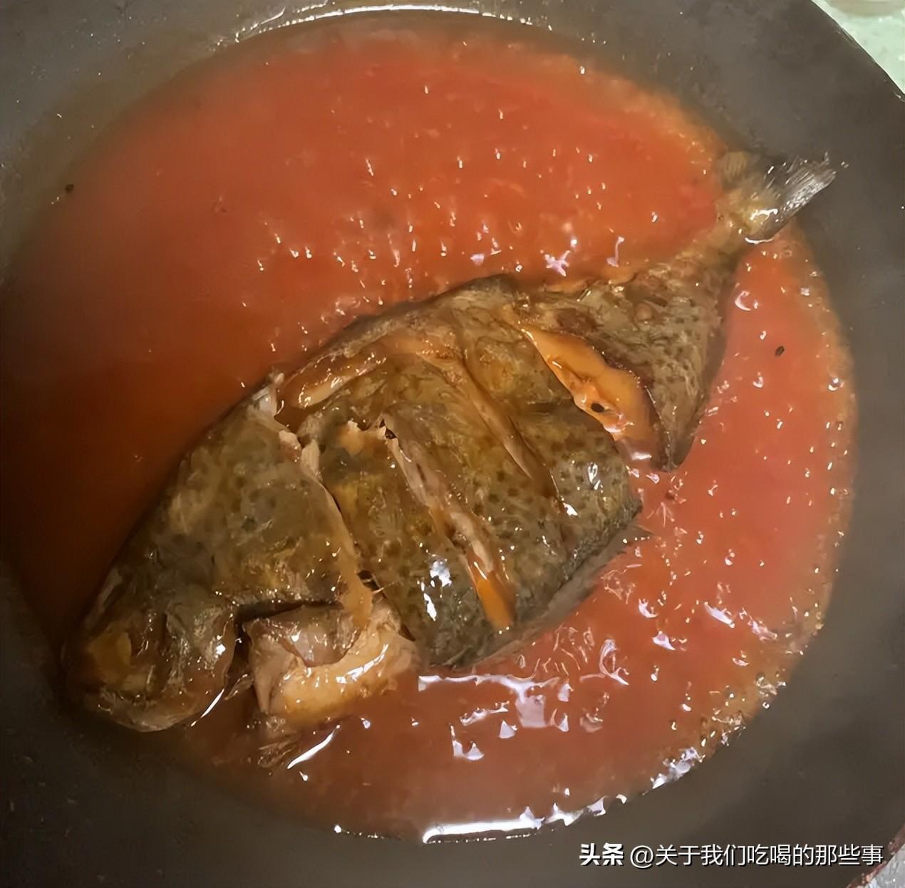 3、鍋裏留底油,放入攪拌好的糖醋汁煮開,下入煎好的鯧魚,蓋上蓋子燉10分鐘。把鯧魚盛入盤中,湯汁加水澱粉勾芡,湯汁濃稠後澆在魚身上即可。