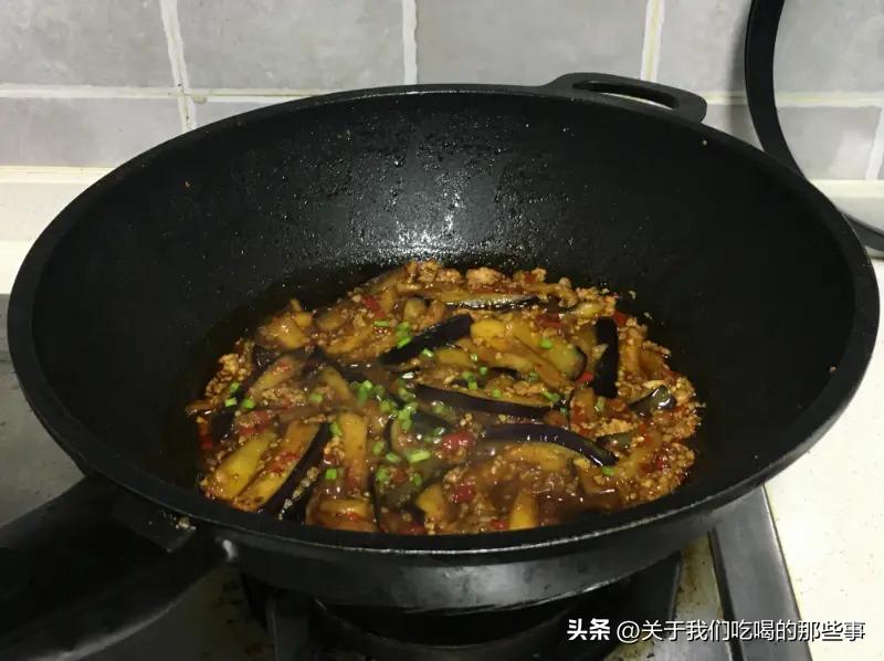 7、鍋裏重新加入少量油燒熱,放入醃好的肉末小火煸炒出油,變色後加入姜蒜末爆香,倒入茄子條翻炒均勻,淋入碗裏的料汁翻炒幾下,淋入水澱粉勾芡,大火把湯汁收至濃稠,撒上蔥花即可出鍋。