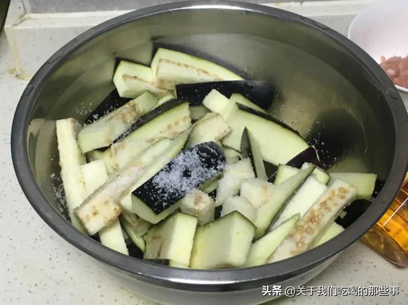 2、茄子用食鹽拌勻後醃製一下,可以破壞網狀結構,這樣不會吸油,炒出來很清爽。