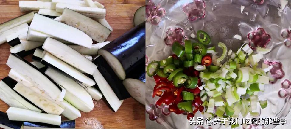 2、小米椒、青椒洗乾淨,小米椒切圈,青椒切丁。接下來處理茄子,紫茄子洗乾淨,不要去皮,把兩頭切掉,然後切成手指粗的長條。