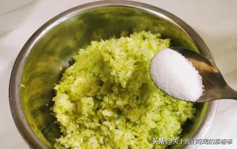 5、大白菜從中間切開,葉子用清水沖洗乾淨,用刀切碎放入盆子裏,加入2勺食鹽,用手翻拌均勻,醃製20分鐘,等到白菜出水後紗布包起來,使勁擠幹水分。這一步是爲了防止白菜出水,白菜的水分很多,如果直接包的話就會出水,導致餡料很稀不好包,不容易成團,容易散。