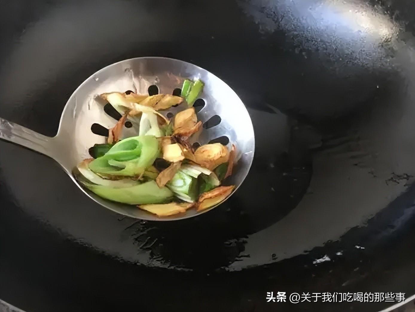 3、鍋里加入適量菜籽油,放入蔥段、薑片,小火炸一會兒,等到顏色焦黃後撈出,蔥姜油晾涼備用。調餃子餡時,很多人都只知道加香油(芝麻油),雖然也香,但不夠香,建議用蔥姜油,去腥增香的效果非常好。