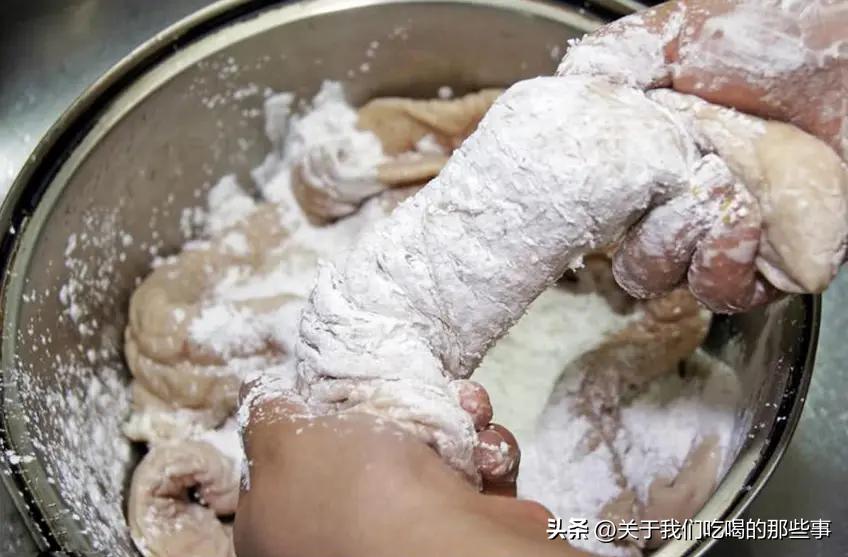 2、向豬大腸中加入一大勺澱粉,澱粉的顆粒細膩,有很強的吸附性,能吸附大腸上的粘液和髒東西,用手不斷地揉搓,潔白的澱粉會變成黑灰色,5分鐘後用清水沖洗一下。