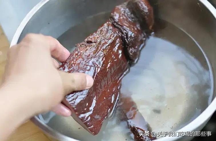 2、拿一塊臘肉,我家的臘肉都是切成小塊,大概半斤左右,每次炒一塊,剛好一人喫一兩,建議大家也這麼做。把臘肉洗乾淨,表面有很多灰塵,放入碗中加入適量清水,浸泡1個小時。臘肉炒之前,建議用水泡一泡,可以去除多餘的鹽分,這樣炒好後就不鹹,這是第一個技巧。