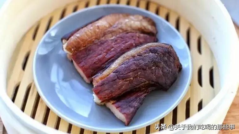 3、泡好的臘肉清洗一下,不要直接切片,用盤子裝好。蒸鍋加水燒開,放入臘肉蒸10分鐘,蒸個半熟即可,取出切成薄片。臘肉蒸一下,能讓肉質變得軟嫩,喫起來不幹不硬,這是第二個技巧。