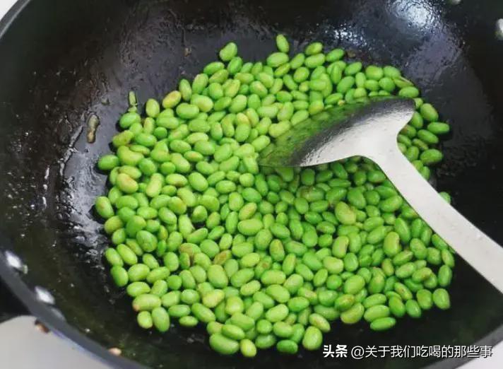 4、鍋裏倒入少量油,四成熱時倒入瀝乾的毛豆,小火翻炒一會兒,等到毛豆顏色變深,都裹上一層薄油後即可關火。
