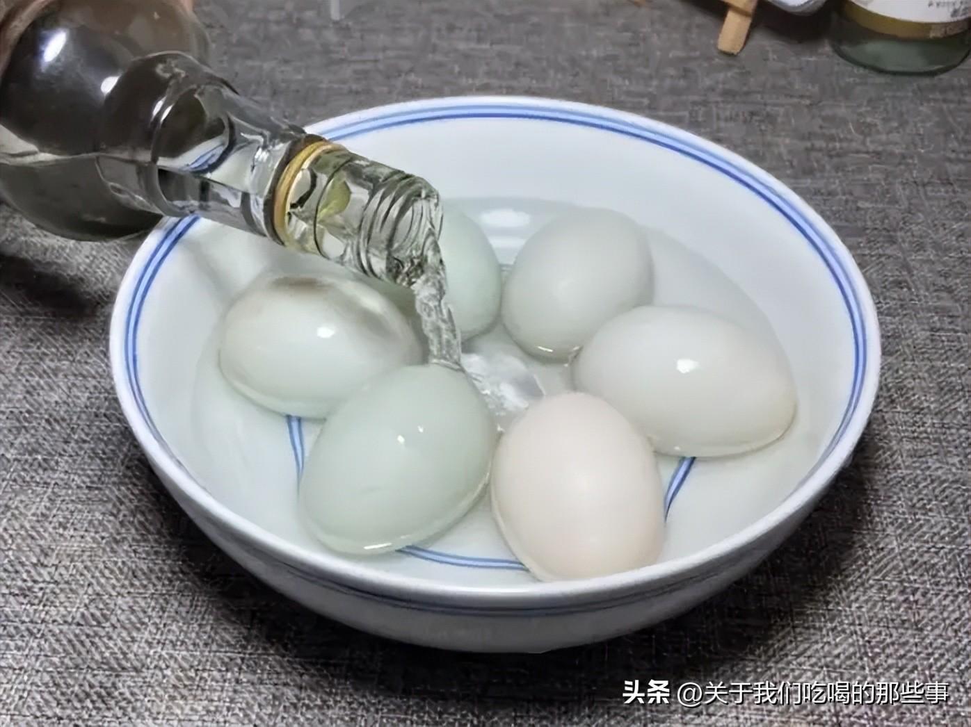 3、準備一碗食鹽和一碗高度白酒,白酒最好是度數高的,用65度的二鍋頭效果好,這是我的經驗。晾乾的鴨蛋放入白酒裏浸泡10秒鐘,白酒可以消毒殺菌,加快蛋白質的轉化,鹹蛋快速成熟。同時白酒也含有豐富的芳香物質,起到增香的作用,讓鹹鴨蛋更香。