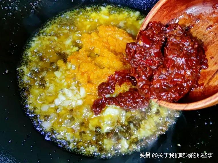 3、大蒜切片,大蔥切段,生薑切片,小米椒切圈。另起鍋加入適量油,燒熱後放入蔥薑蒜爆香,加入黃辣椒醬、郫縣豆瓣醬炒出紅油。