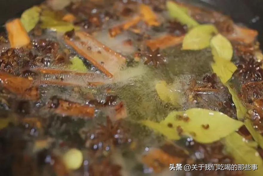 切一些蔥段、薑片,再準備一點花椒、八角、香葉,洋蔥等食材。鍋裏倒入適量油,放入所有的香料,開小火加熱炸一會兒,等到所有的香料都顏色金黃,蔥姜變得焦黃就可以關火了,撈出香料渣,油晾涼備用。
