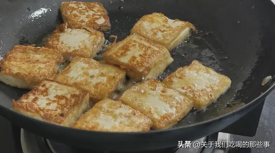 要注意的是,煎豆腐不要經常翻面,一面煎黃後再翻面,總共翻兩次面就行了,這樣能保證完整不碎。