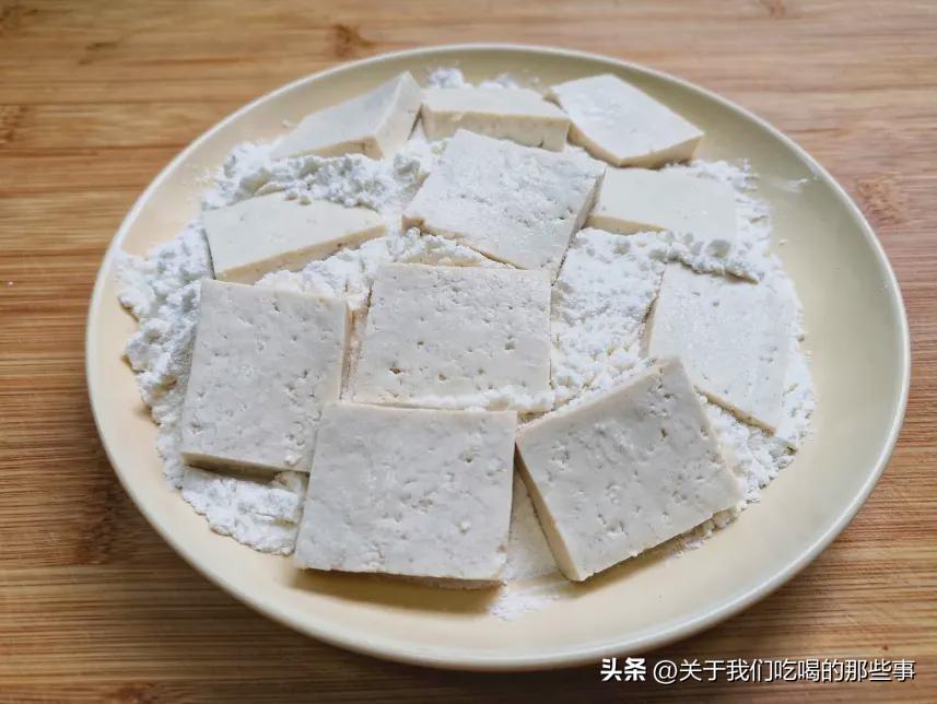1、豆腐用鹽水煮一下,然後裹上澱粉。鹽水煮豆腐,能讓豆腐變得更結實,不容易碎;裹上澱粉,相當於一個保護層,讓豆腐煎得更焦脆,還不會掉皮。