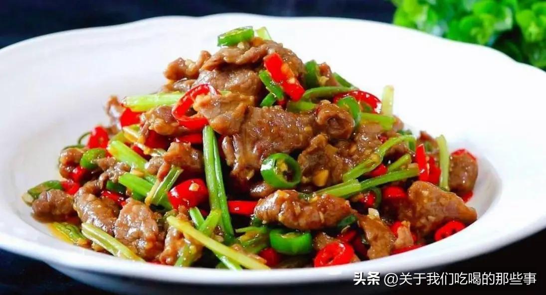 3、鍋裏留底油,放入姜蒜末、辣椒,大火炒出香味,倒入芹菜炒1分鐘,斷生後加入適量食鹽、生抽、蠔油調味,最後倒入牛肉片,翻炒均勻即可出鍋。
