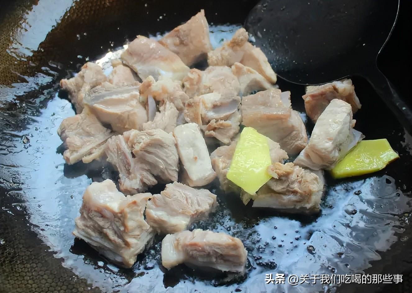 5、另起鍋加少許油,燒熱後放入薑片和排骨,翻炒兩三分鐘,再倒入足量開水,大火煮開。