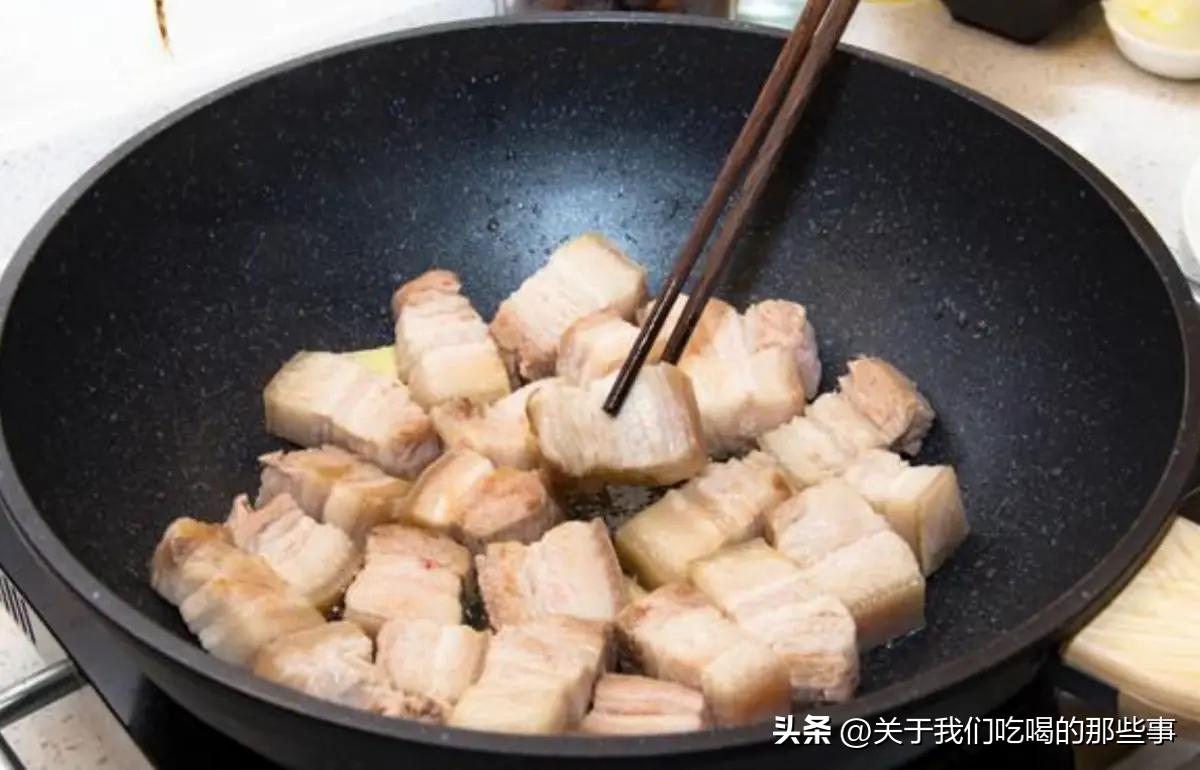 5、乾淨的鍋內加少許油,放入五花肉塊,小火翻炒,至表面微黃。若是不粘鍋,可以不放油,直接倒入肉塊翻炒煎制。