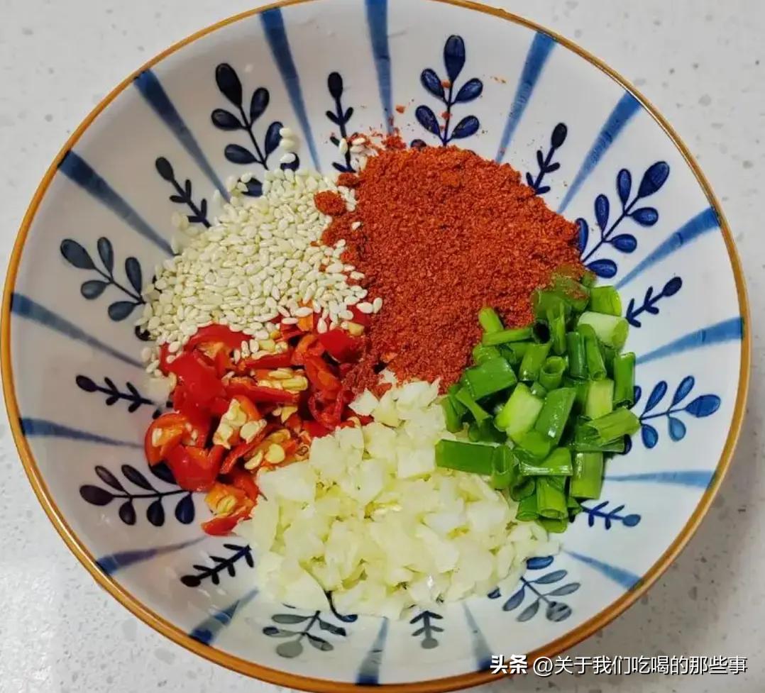 首先將大蒜、小米椒、香蔥分別洗淨,再切成蒜末、小米椒圈、香蔥花。處理好後裝進碗中,並放入熟芝麻、粗細辣椒麪。