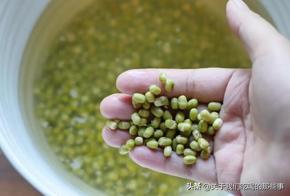 3、放涼後換一次水,再浸泡一個晚上,讓綠豆吸收一部分水分,豆子變大。泡到第二天,將水倒掉。