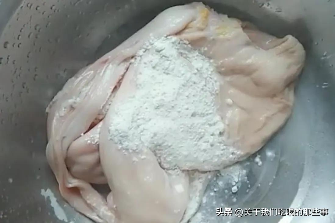 4、處理好後繼續加麪粉抓揉,並加一大勺醋抓揉兩分鐘。最後用流動水將裏外沖洗乾淨,就大功告成了,無異味,喫得放心。