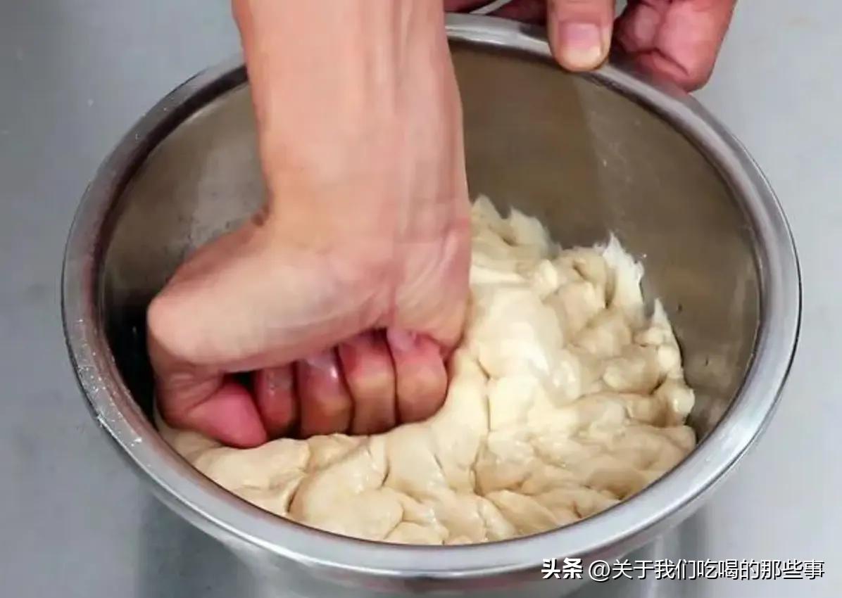 3、處理好後,不要使勁揉麪,而是要用手指關節去揣面,這一步不要弄錯了。經過揣面後,做出的油條菜會不硬。