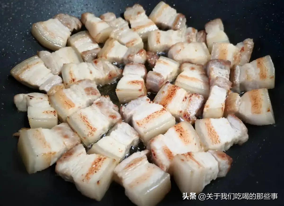 經過上一步處理後,將五花肉切成小塊。然後另起鍋加少許油,放入五花肉塊小火煸炒,炒到出油、肉塊表面變色。煸炒後再燉煮,紅燒肉會肥而不膩。