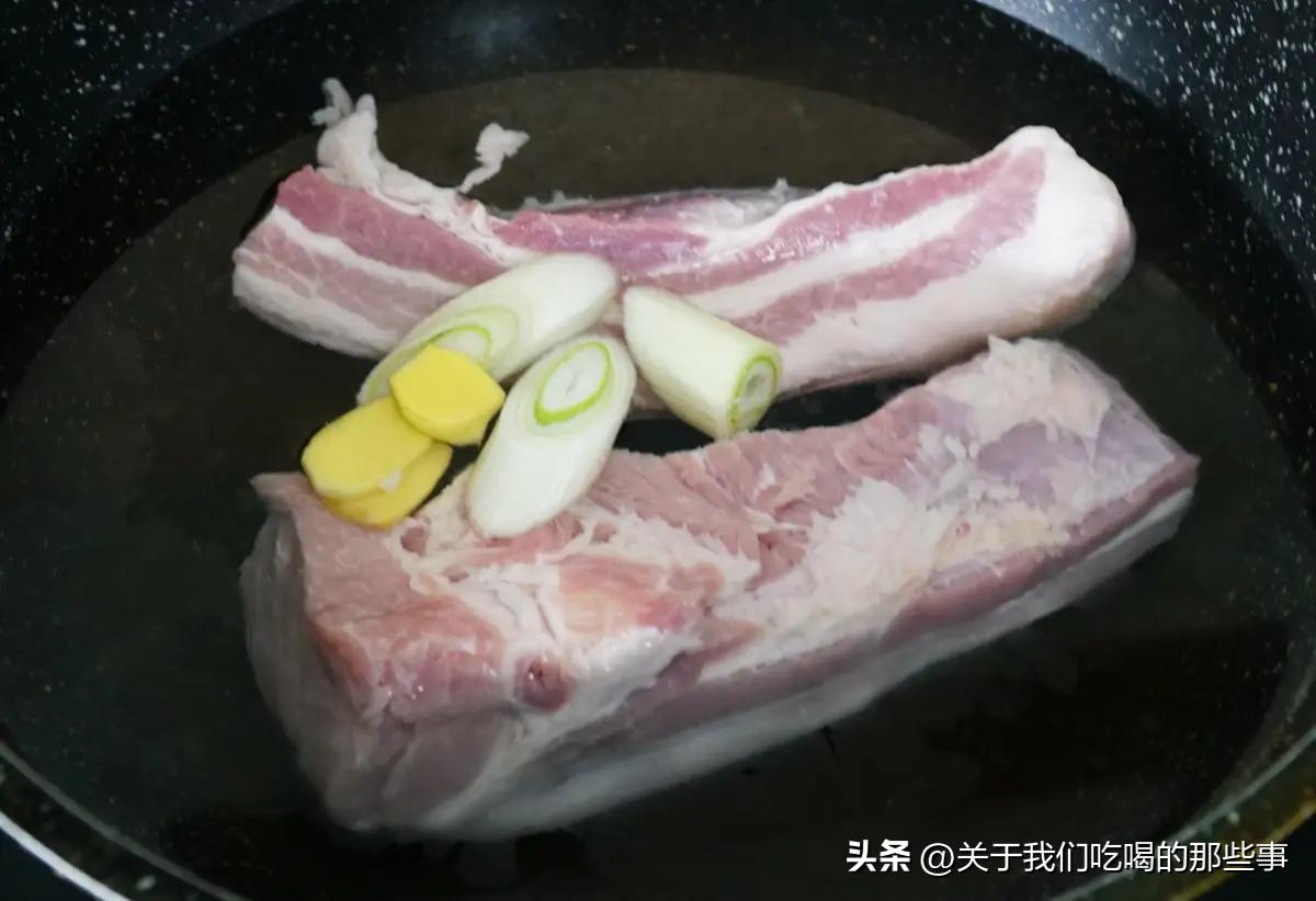 五花肉用流動水沖洗一下,切成兩三塊。切好後放進鍋內,並倒入適量冷水,再加入料酒、薑片,開大火煮開,將浮沫去掉。處理好後繼續煮五分鐘,再將五花肉撈出,用溫水清洗一遍。