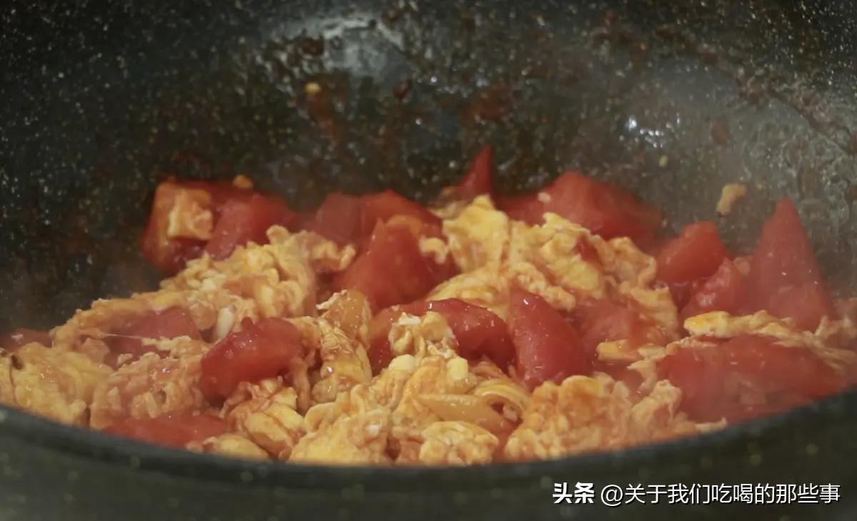 第五:不要西紅柿剛下鍋就放雞蛋塊。想要口感好,要在西紅柿炒出比較多的汁水後再倒入雞蛋塊。