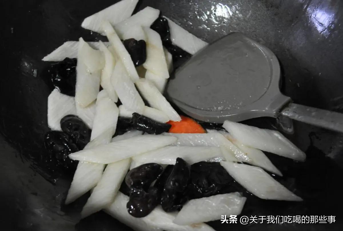 6、另起鍋加油,燒到五成熱,放入蒜、胡蘿蔔翻炒,胡蘿蔔片斷生後倒入山藥、黑木耳翻炒。