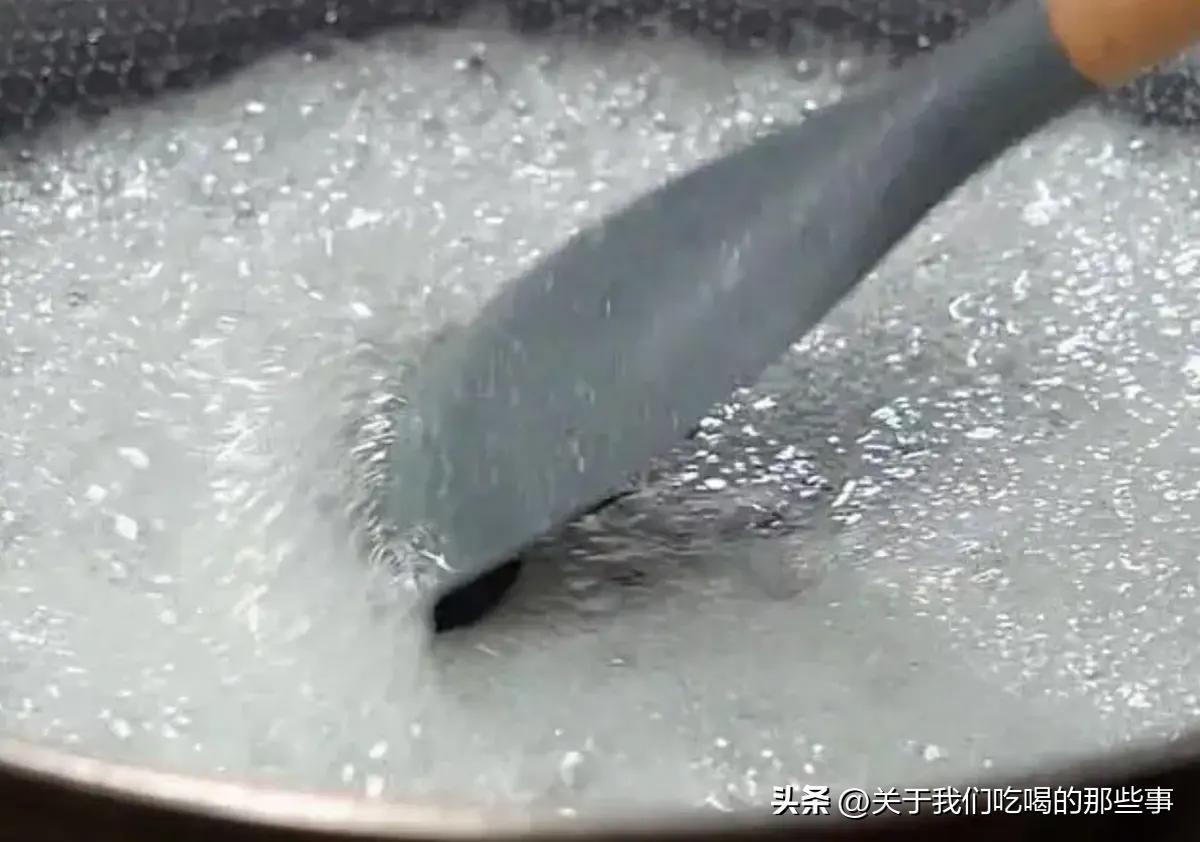 2、冰糖都化了轉小火,煮到糖水翻泡沫,由小泡泡變成密集的大泡泡,這時沒有水了,成了糖漿。