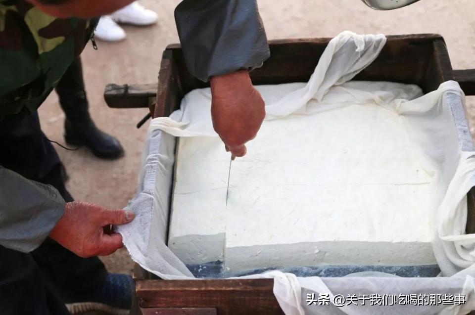 首先說一下豆腐的製作,大豆磨成豆漿,過濾掉豆渣,點入滷水凝固成豆腐腦。豆腐腦倒入紗布裏,上面壓上板子和重物,直到豆腐成型。