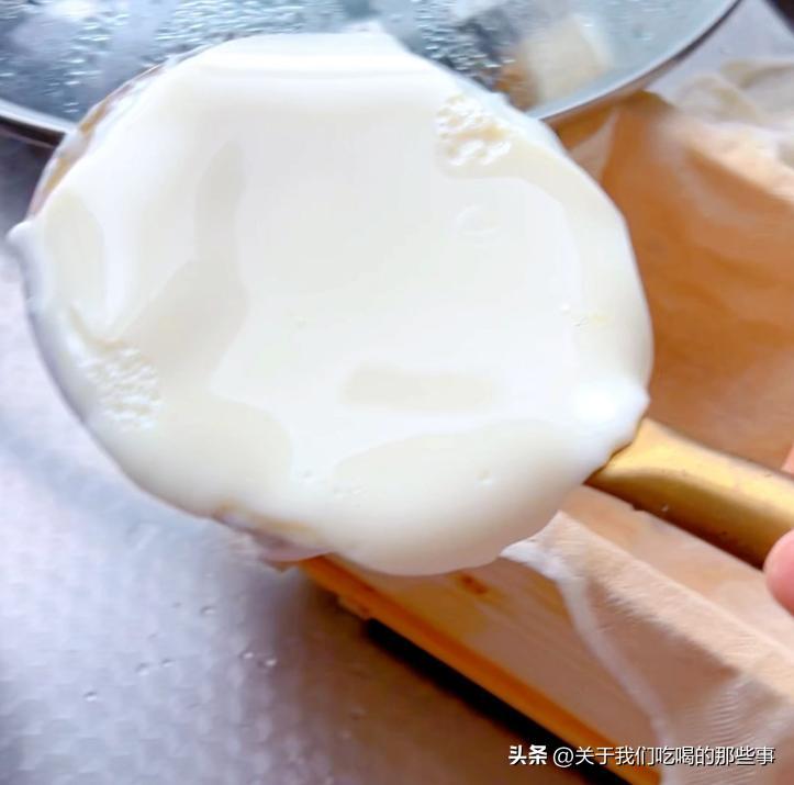 - 等到豆腐腦成型後,在模具裏鋪上紗布,倒入豆腐腦後蓋上板子,壓上重物後等10分鐘,豆腐就做好了,口感緊實,香味濃郁。