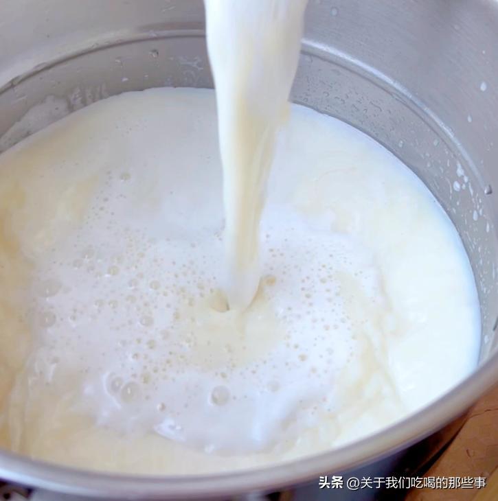 - 豆漿過濾掉豆渣,倒進鍋裏煮開。白醋加入4倍清水攪拌均勻,等到豆漿溫度降到85度左右,倒入兌好的白醋水,攪拌均勻後蓋上蓋子,靜置10分鐘。