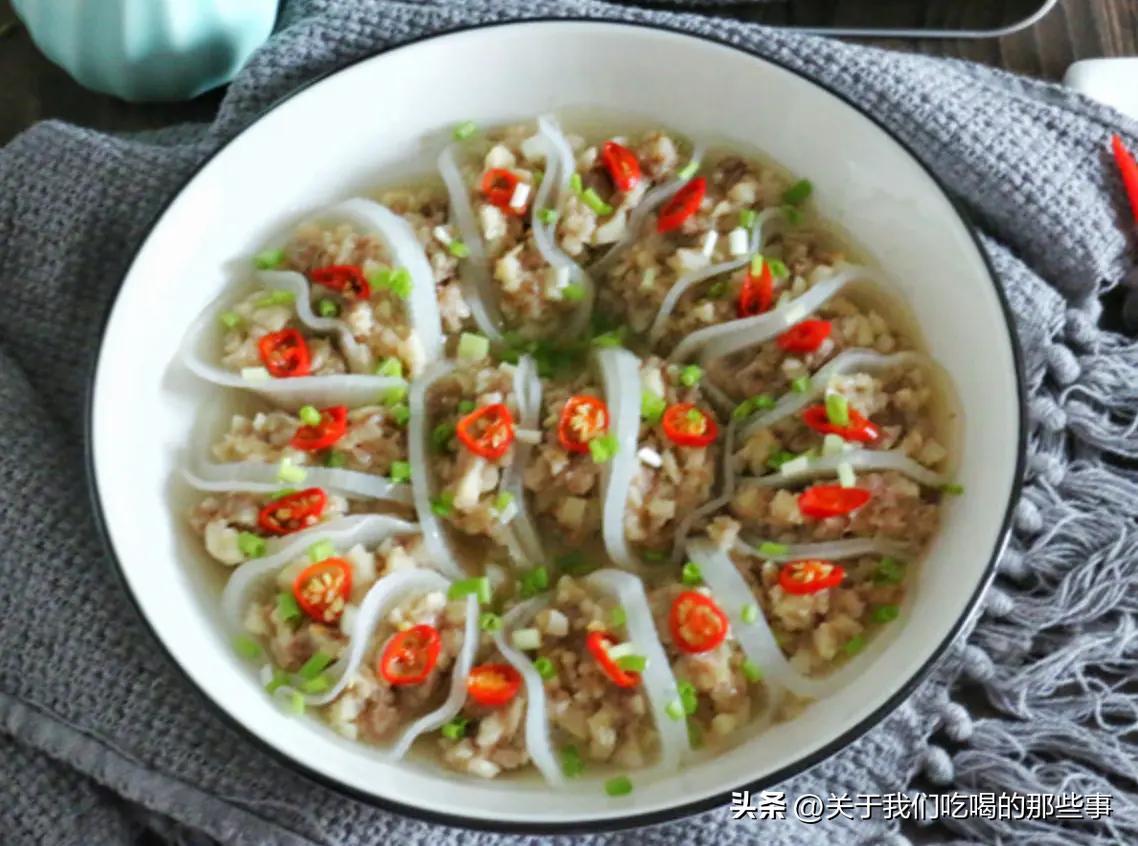 3、取蘿蔔片,放入適量肉餡,向內捏一捏放進盤內。等所有的蘿蔔釀肉都入盤了,放入蒸鍋,再撒點辣椒圈。