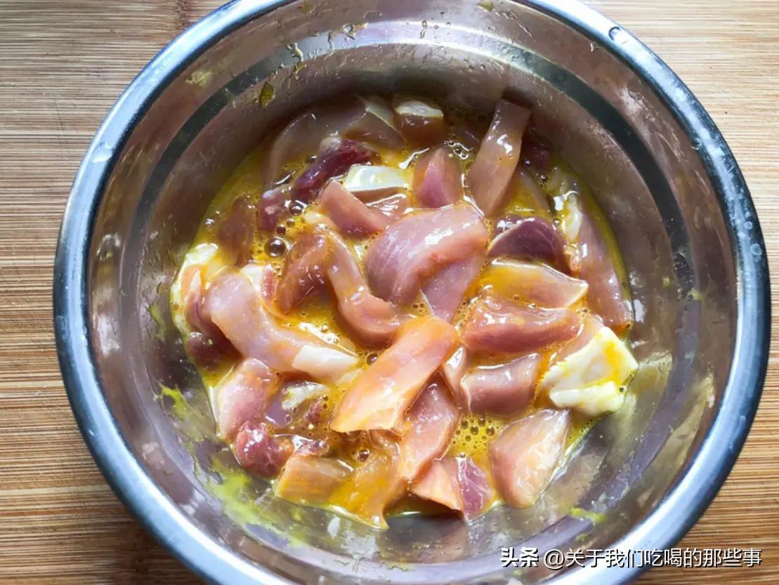 1、豬裏脊或者雞胸肉,沖洗乾淨,切成粗條。切好後加入鹽、白胡椒粉、雞蛋、澱粉抓拌均勻,醃製三十分鐘入味。