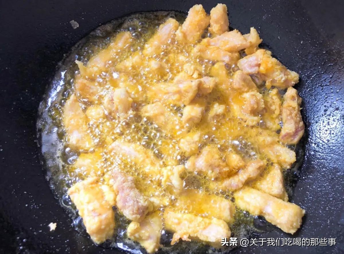 4、鍋內加油,量多一些,燒熱後放入肉條,炸成金黃色撈出。全部炸完後,再次升高油溫復炸一下,變成酥脆的口感。