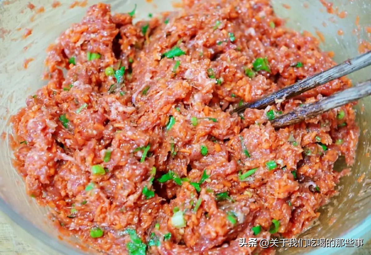 1、羊腿肉剁成肉末。胡蘿蔔洗淨去皮,擦成細絲,再剁成碎丁。香菜洗淨,取香菜梗切碎。姜去皮洗淨切末。蔥洗淨切末。花椒入鍋煮出味道,再盛出放涼。