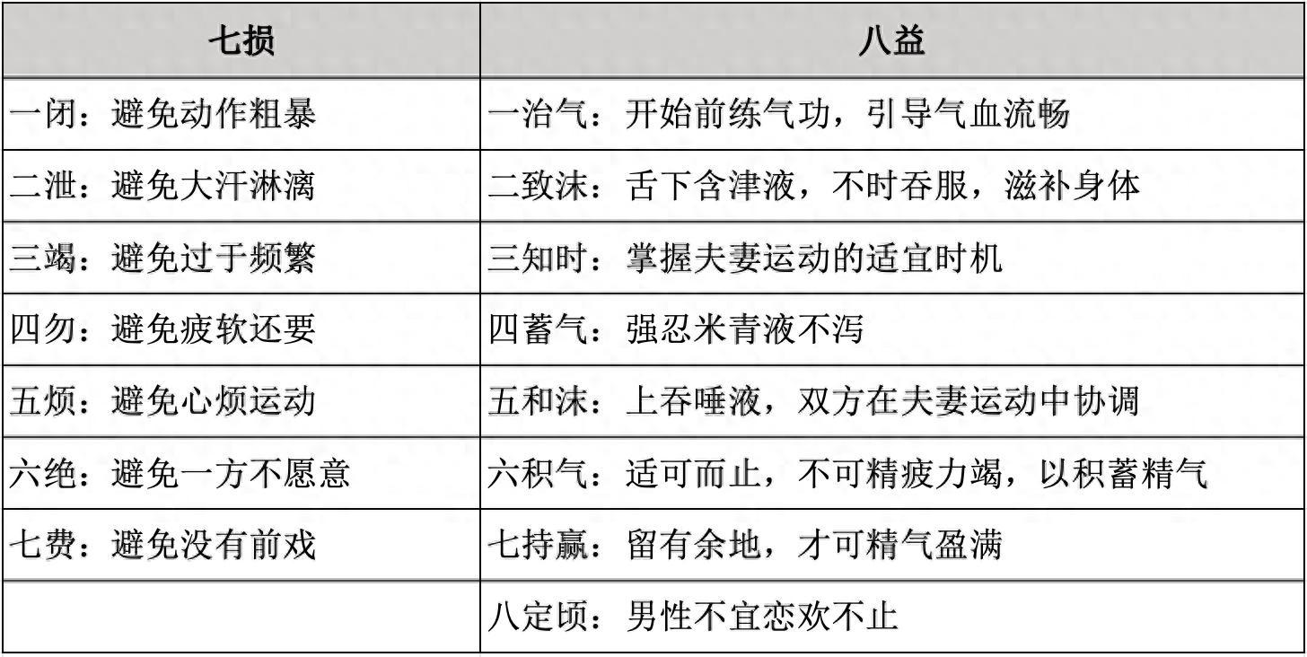 “七損八益”源自《黃帝內經》的說法,從字義上看是關於古代夫妻生活中的該做的和不該做的事情的介紹。所謂七損,是指夫妻生活中七件有損健康的事情;而八益,則是指八種有益健康的做法。