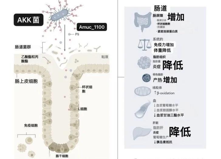 這是因爲AKK菌不僅能夠充當人體腸道“守衛軍”,幫助維持腸道黏膜抵禦不良病菌侵入,還能幫助人體脂肪代謝、調節血糖。它們賴以生存的食物——粘蛋白,在消化分解後還能幫助維持腸道粘膜完整性。此外,AKK菌還能跟腸道免疫系統“夫唱婦隨”,共同刺激免疫細胞發育,不斷壯大“守衛軍”團隊。
