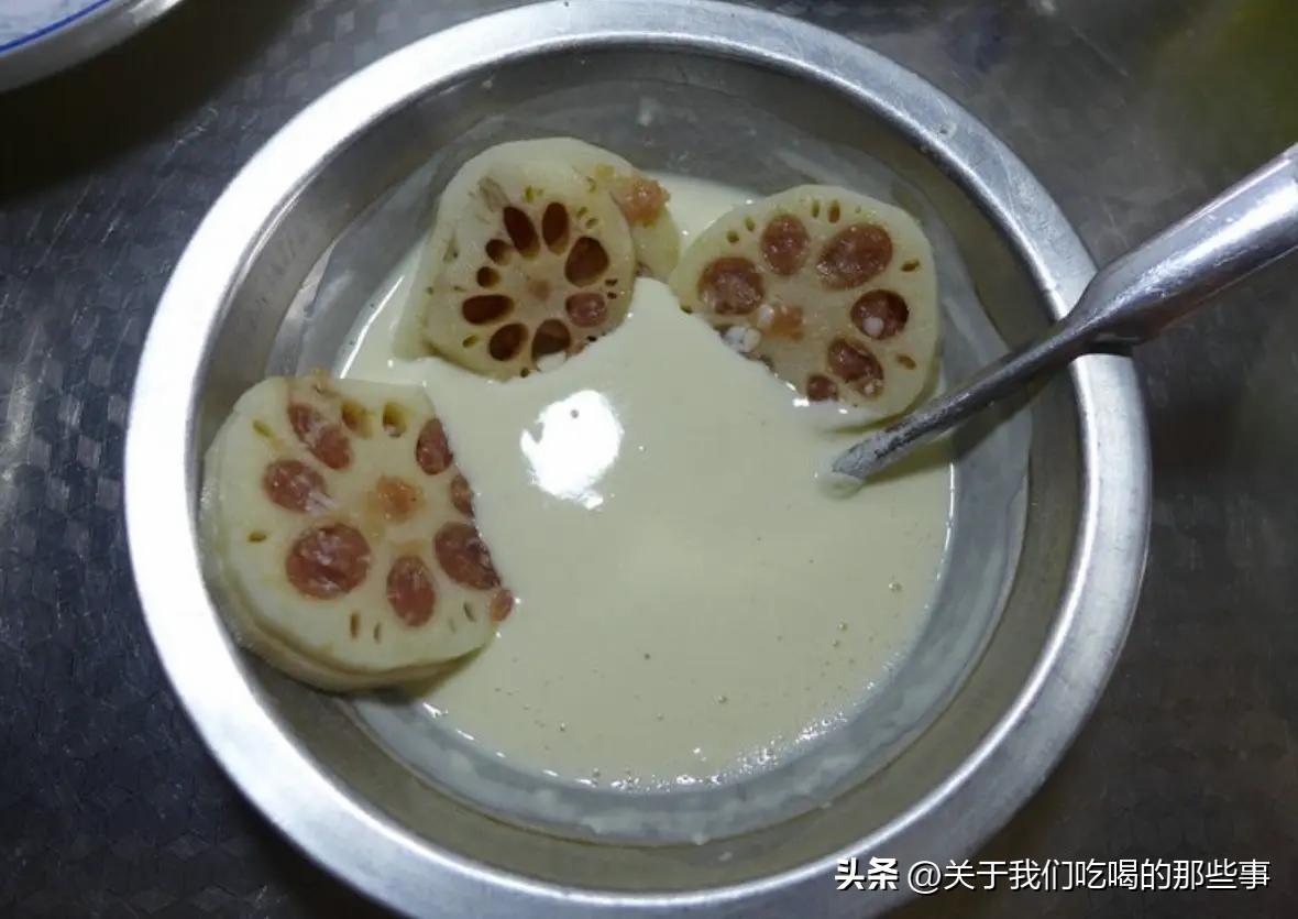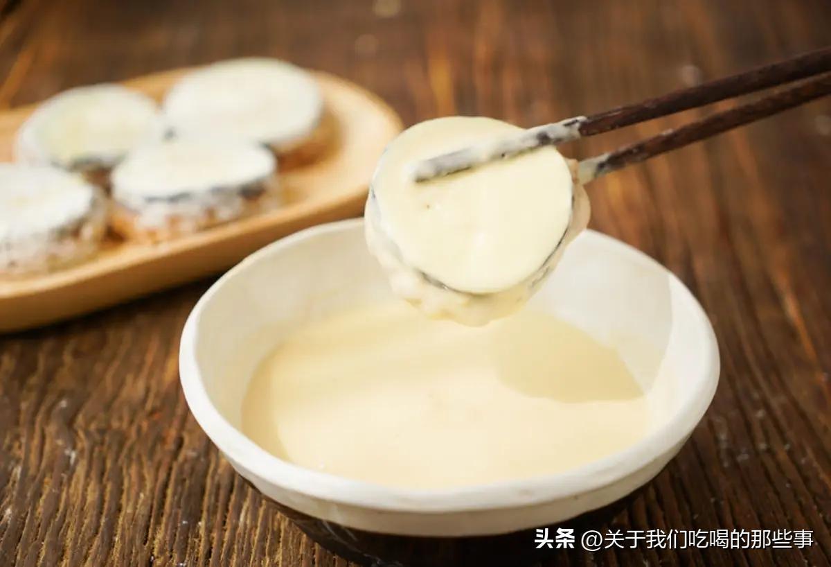 蓮藕去皮,切成薄片,再清洗兩遍,瀝乾水分。按照上述做法把麪糊調好。
