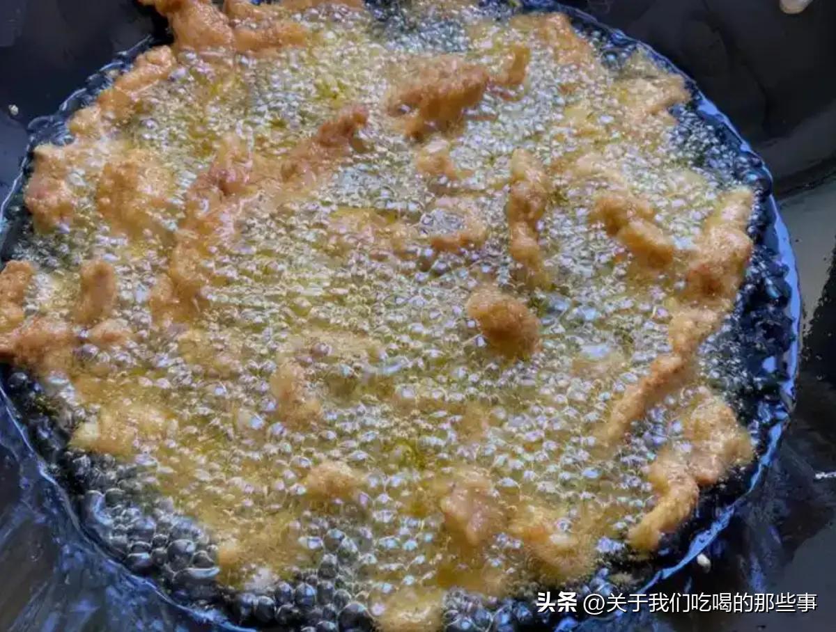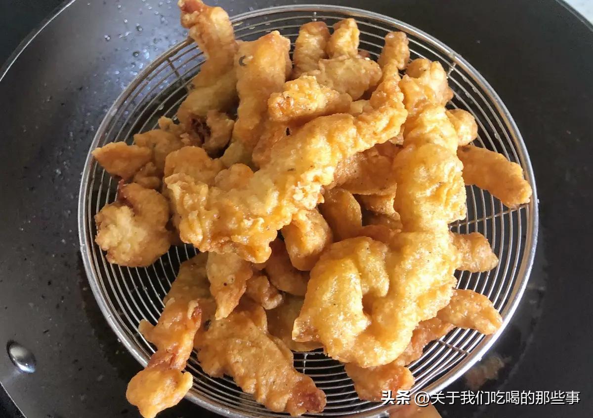 豬肉入鍋後炸成金黃色,炸好後撈出。全部炸完了轉大火,升高油溫,微微冒煙時放入酥肉,保持大火炸二三十秒,顏色略微加深後快速撈出,炸酥肉就做好了。