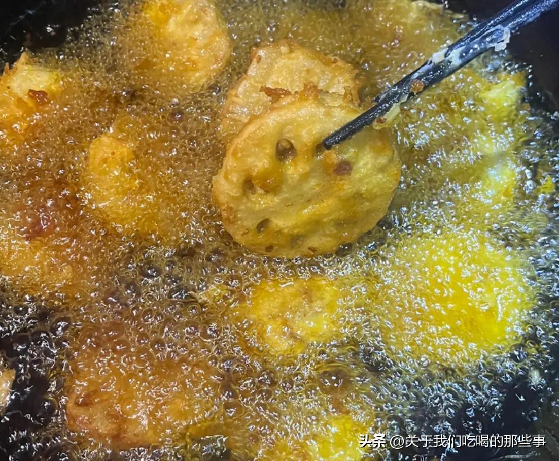 接着給藕片上放些肉餡,再輕輕蓋上一片,做好藕夾。鍋內加油,燒到五六成熱轉小火,取藕夾裹上面糊,再放進鍋內,炸成金黃色。