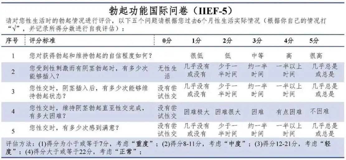 此外,還可以通過“IIEF-5”量表自測,瞭解ED的嚴重程度,從輕度到重度一目瞭然。如果結果顯示問題明顯,建議儘早尋求專業幫助。