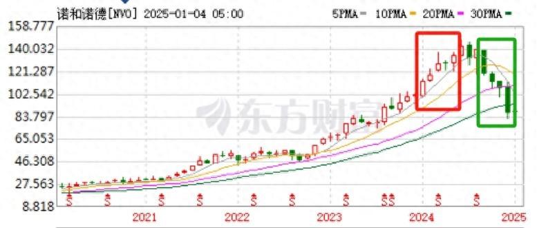 繁榮背後,司美格魯肽造就的“盛景”或將化爲泡沫。近期,諾和諾德股價連續多月大跌,市值縮水約4000億。急轉直下的走勢,暴露了市場對其王牌產品司美的長遠發展態度。