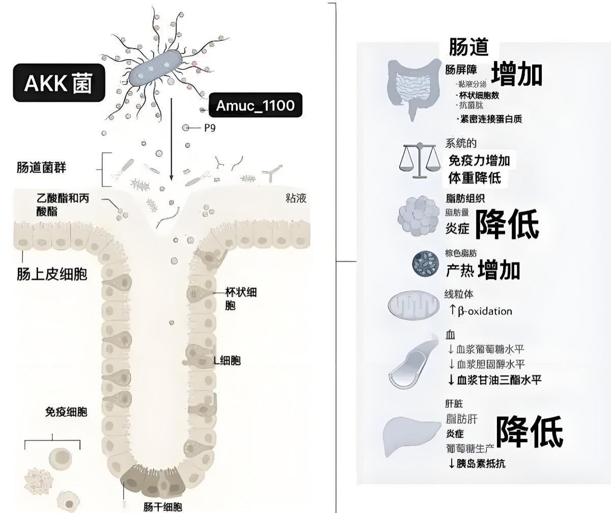 AKK001研發負責人介紹,與司美等GLP-1激動劑不同,AKK可以激活人體天然GLP-1分泌、抑制食慾,並通過攜帶的一種特殊P9蛋白加速棕色脂肪燃燒,調節基礎代謝的同時實現無副作用“躺瘦”。