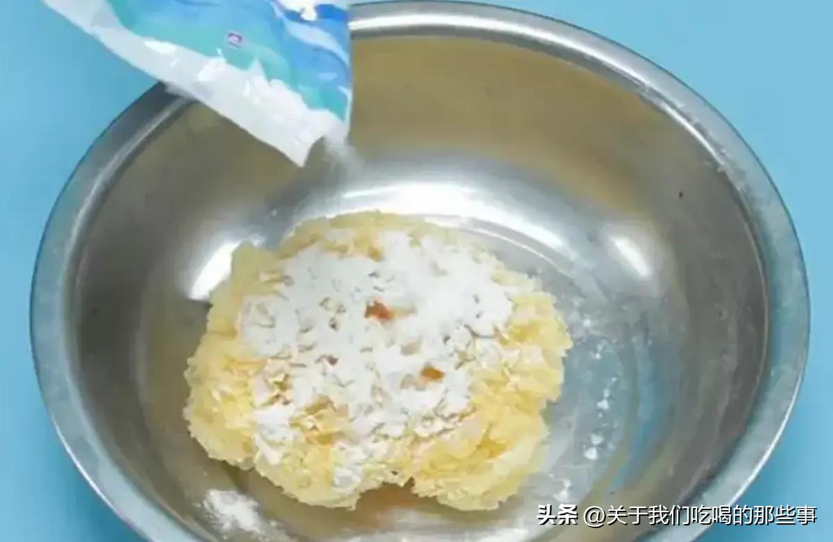 4、銀耳泡半個小時後,將碗裏的水倒掉,再加一小勺鹽和適量麪粉,下手抓一抓,每一處都裹上面粉,處理好後靜置十分鐘。(食鹽有殺菌作用,澱粉有很好的吸附性,用這兩物抓揉銀耳,就能洗得特別乾淨,沒有一點雜質)