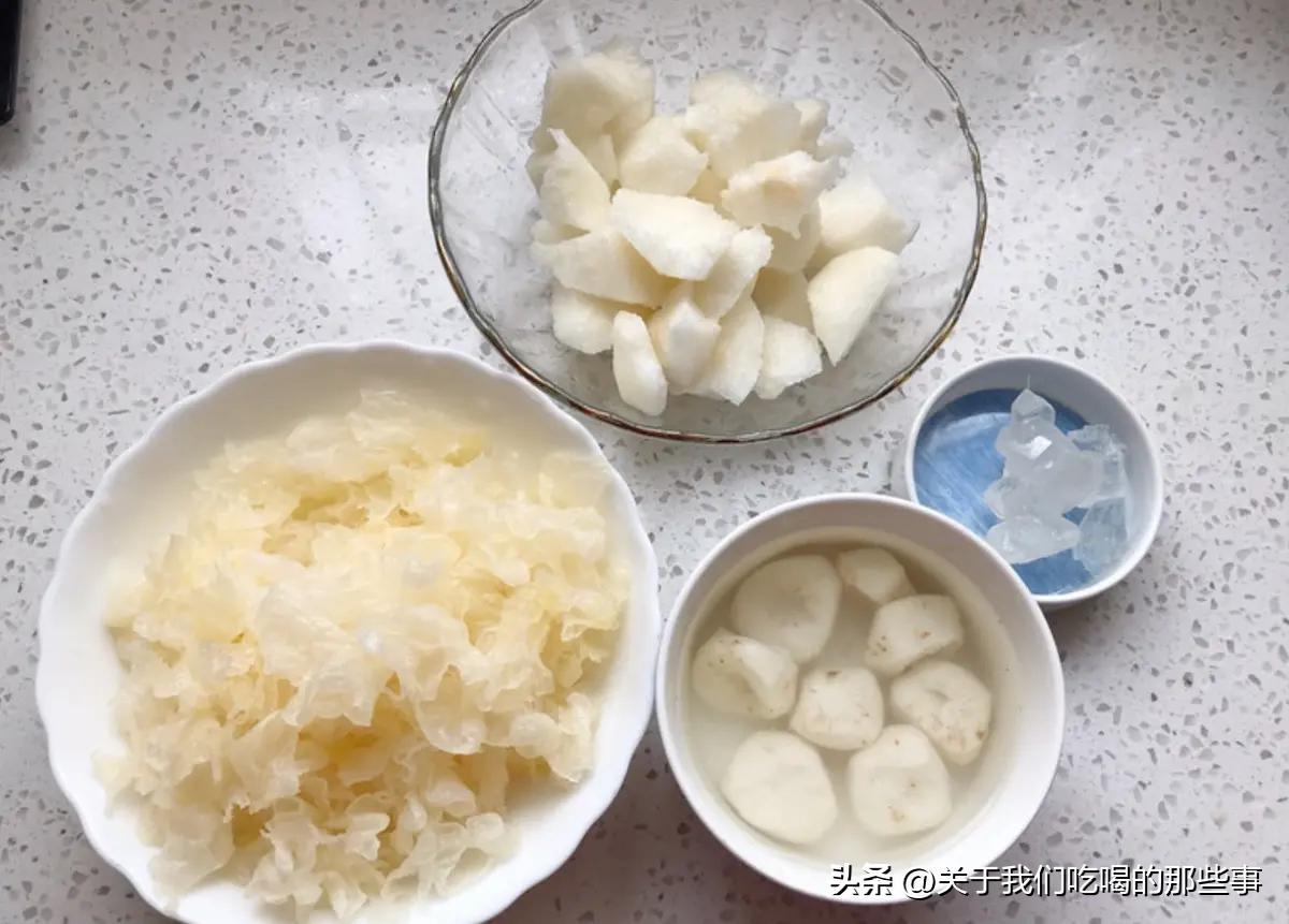 準備幹銀耳、馬蹄、雪梨、紅棗、枸杞、幹百合、幹蓮子、冰糖。