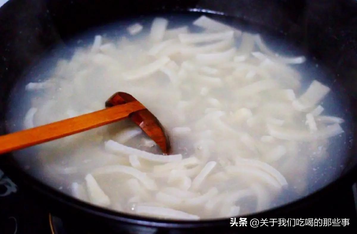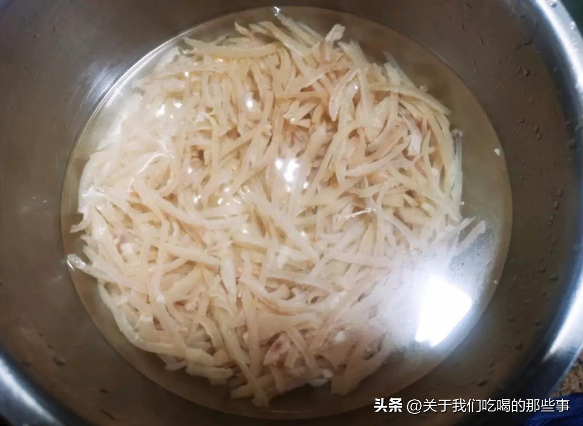 4、處理好了切成小條,裝進大盆內,再加一勺小蘇打和一勺食鹽,下手揉搓,大約三分鐘後加溫水清洗。洗過了再加鹽和小蘇打揉搓,這樣反覆幾次,直到水面沒有大量油脂。