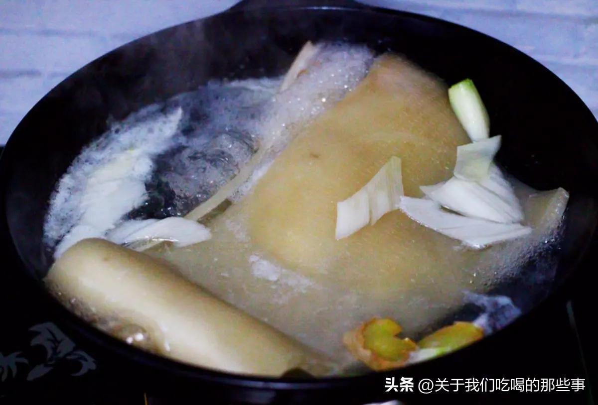 做豬皮凍,記住一個比例,那就是一斤豬皮,放三斤水。這個比例做出來的豬皮凍不會不成形,而且口感非常好,既有彈性,又不會太結實嚼不動。