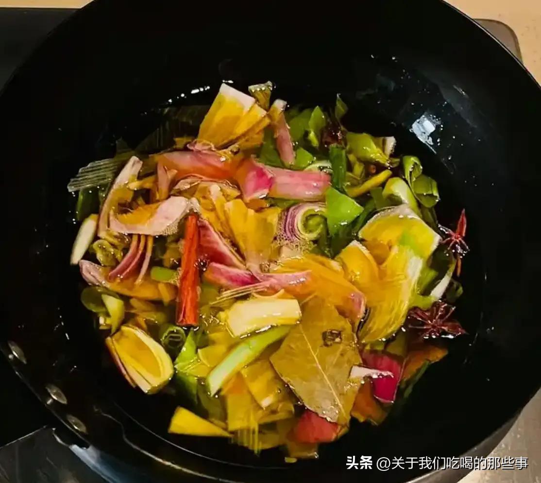 3、鍋內倒入菜籽油,大火加熱,燒到微微冒煙時關火。然後等到溫熱時,放入薑片、蔥段、洋蔥塊、芹菜段、八角、香葉、桂皮,開小火炸一段時間。