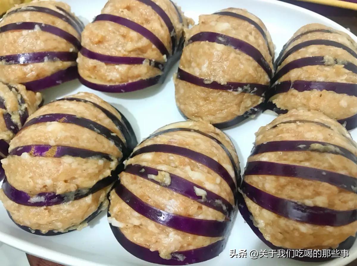 4、肉餡塞入茄子內,越飽滿越好。處理好後,給表面撒一層幹澱粉,更有利於定形。