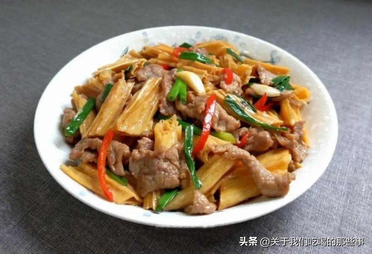 搭配肉片的蔬菜有很多,可以試試這道菜——腐竹炒肉片,喜歡的話照着做。